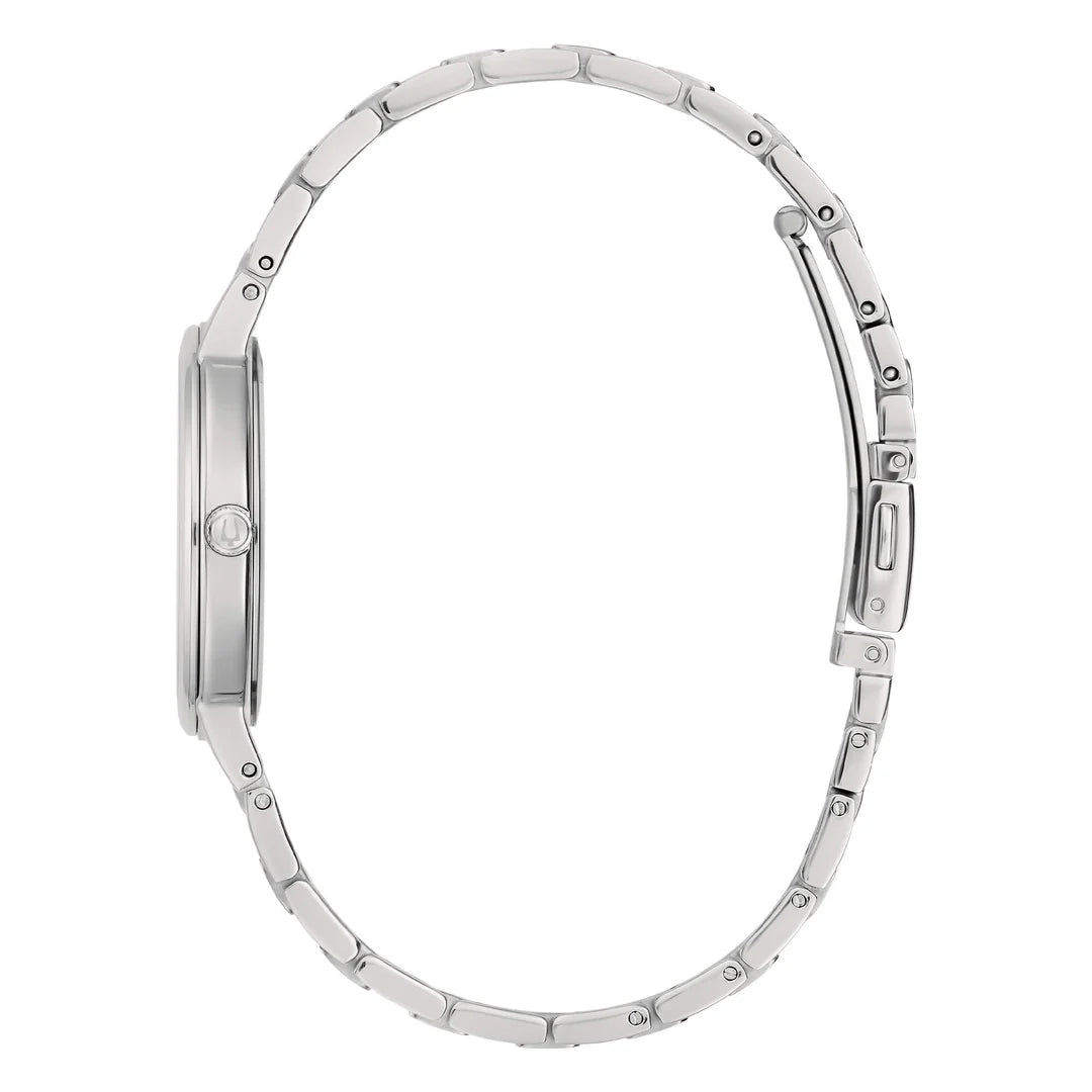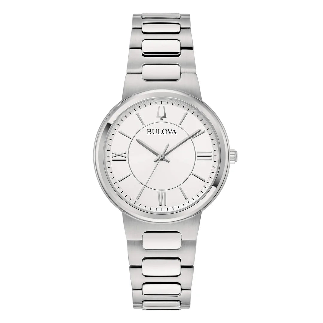 Orologio da donna del brand Bulova della collezione Classic. Orologio solo tempo con cassa in acciaio di dimensione 32 mm. Quadrante di colore bianco con tacche e numeri romani e cinturino in acciaio con chiusura deployante. Orologio con movimento al quarzo. Resistenza all'acqua: 3 ATM. La referenza è 96L334.