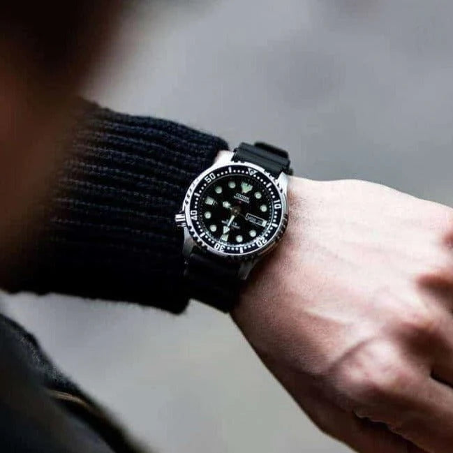 Questo modello presenta cassa rotonda in acciaio di 42 mm, quadrante con indici e sfere ad alta luminosità, cinturino in gomma e caucciù, resistente a possibili danni antiestetici, ghiera girevole unidirezionale, fondo e corona serrati a vite.
