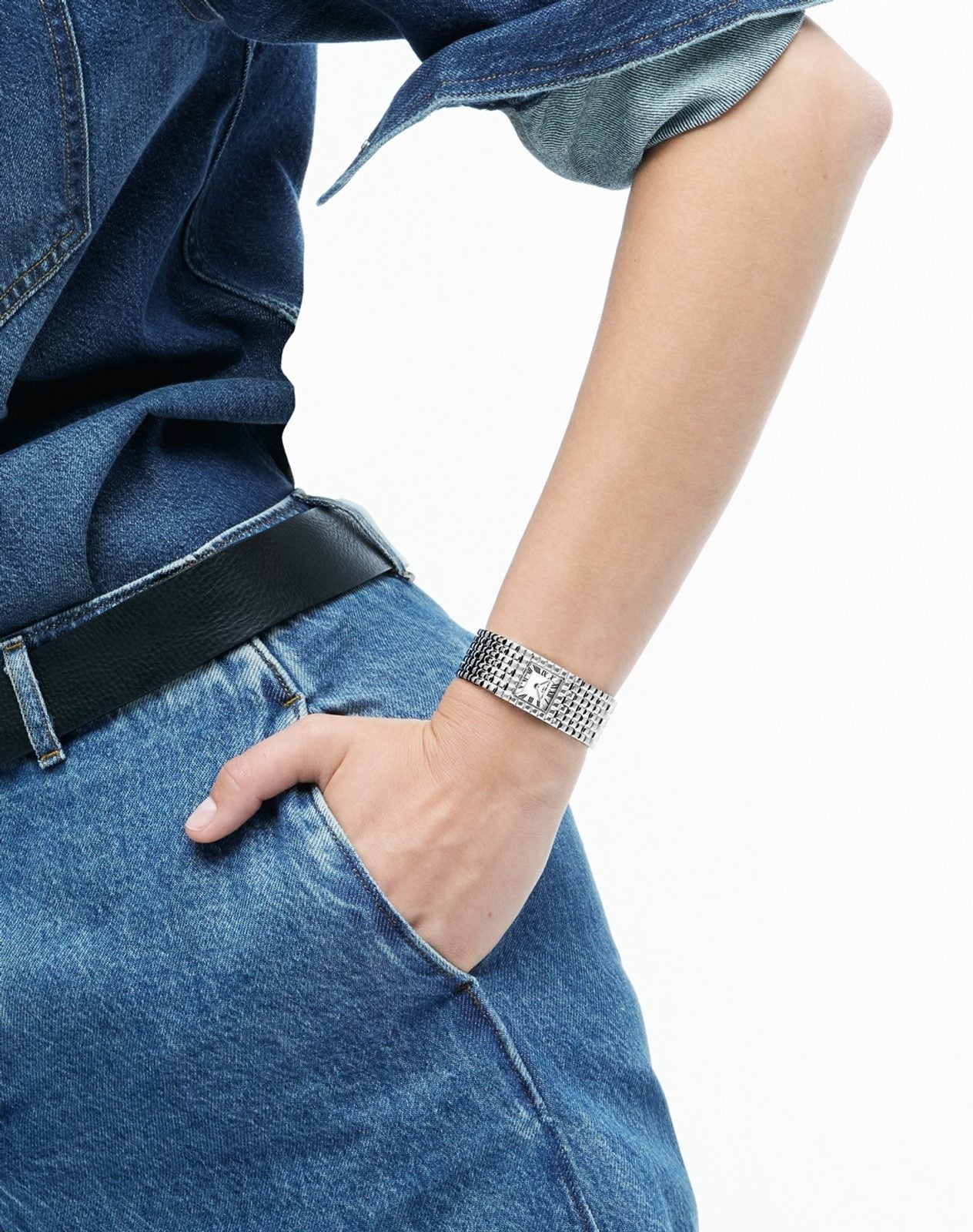 Frederique Constant rispolvera lo spirito ribelle dei primi anni 2000 con il ritorno della Classics Manchette. Non solo un orologio, ma un vero bracciale glam: sette maglie flessibili, chiusura invisibile e quadrante quadrato. Il motivo Clou de Paris si ripete sul cinturino e sul quadrante, per un look deciso e originale. Un segnatempo che sfida la tradizione con leggerezza e stile, pensato per chi vuole distinguersi senza prendersi troppo sul serio.