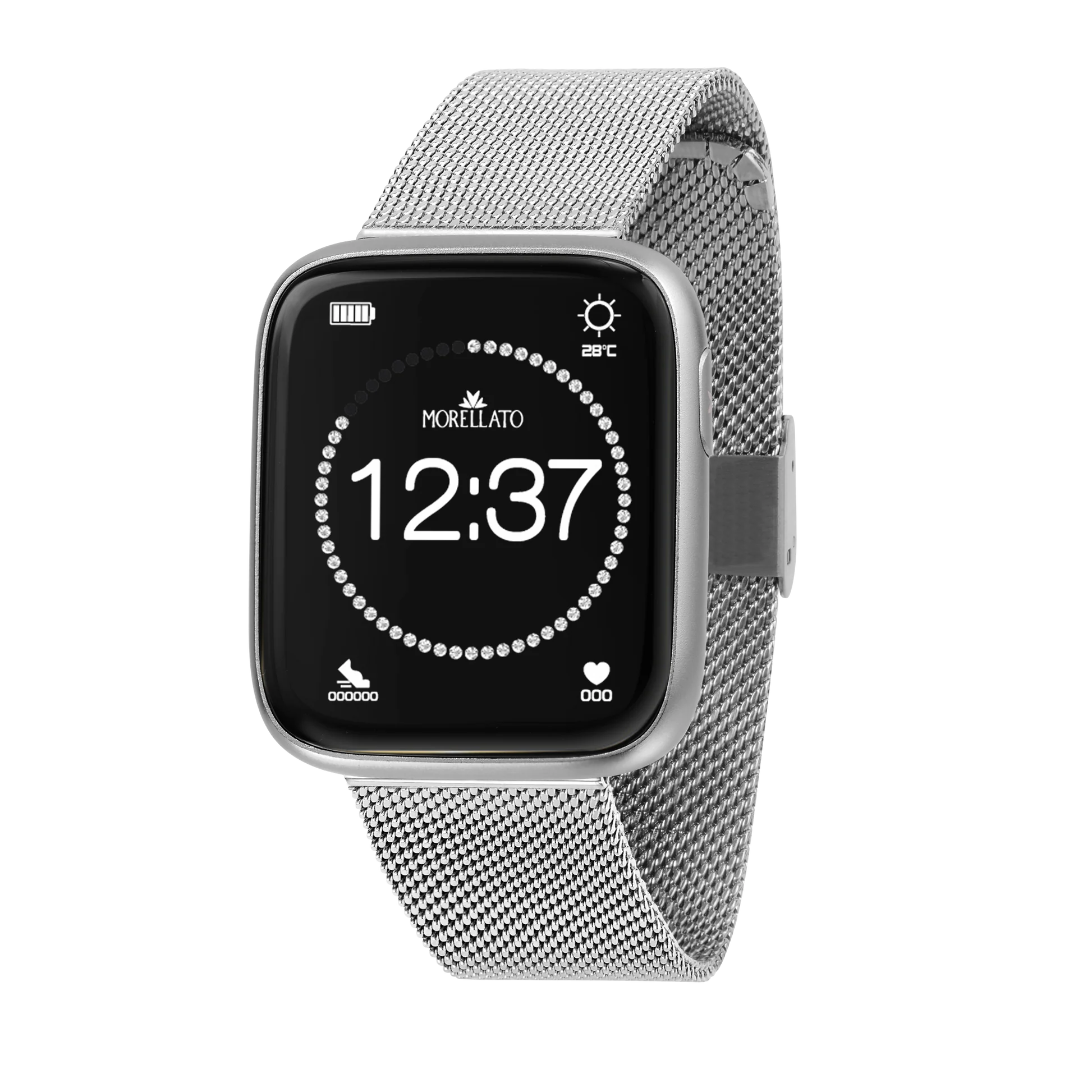 - Smartwatch Morellato della collezione M-01 in acciaio silver e cinturino in maglia mesh con chiusura di tipo milanese clasp. Dimensione della cassa 34,5 x 40 mm Spessore della cassa 11,80 mm Resistenza all' acqua Ip68 Funzioni Connettività Bluetooth, microfono e speaker, notifiche, avviso di chiamata, contapassi, cardiofrequenzimetro, calcolo calorie, monitoraggio del sonno, drink reminder, multisport, cronometro, meteo, musica, quadrante full touch personalizzabile.