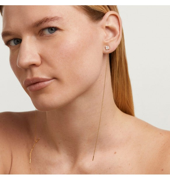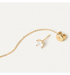 Orecchini pendenti lunghi realizzati in argento 925% con finitura dorata. Cristallo bianco a lobo dal diametro di 5mm e catena pendente e rimovibile dalla lunghezza di 17 cm. Chiusura con farfallina.