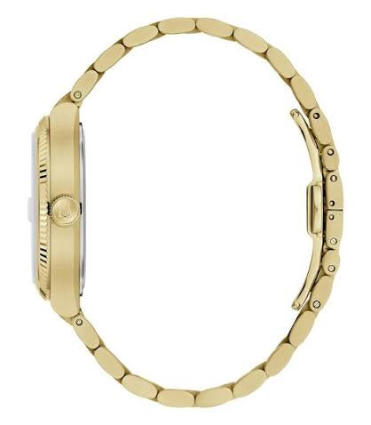 Orologio Bulova Super Seville, solo tempo uomo, una elegante rivisitazione dei modelli anni '70 con cassa a forma cuscino in acciaio pvd oro giallo da 38 mm, quadrante silver con ndici e lancette luminescenti. Datario alle ore 3. Lunetta zigrinata. Vetro zaffiro. Movimento al quarzo High Precision ad alta frequenza 262kHz, e cinturino in acciaio pvd oro giallo. Impermeabilità di 3 atm.