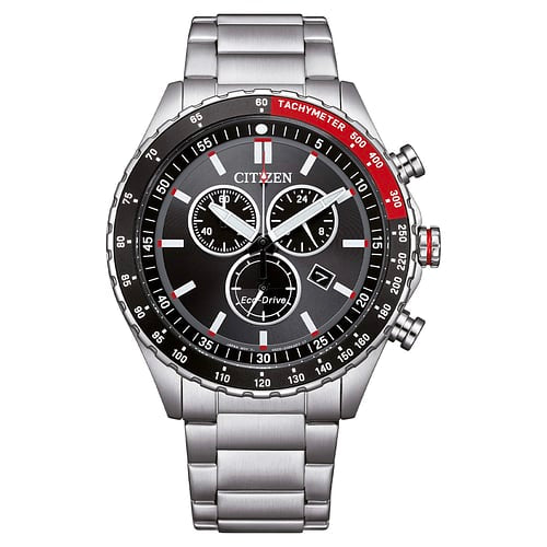 Orologio di Citizen della collezione OF Collection 2026. Orologio eco drive da uomo con cassa in acciaio con fondello serrato a vite e diametro di 43 mm; quadrante nero con indici applicati e ghiera nera e rossa, vetro minerale. Bracciale in acciaio con chiusura a pulsante. Resistenza all’acqua di 10 ATM e movimento eco drive con riserva di carica fino a 6 mesi. La referenza è: AT2566-88E.