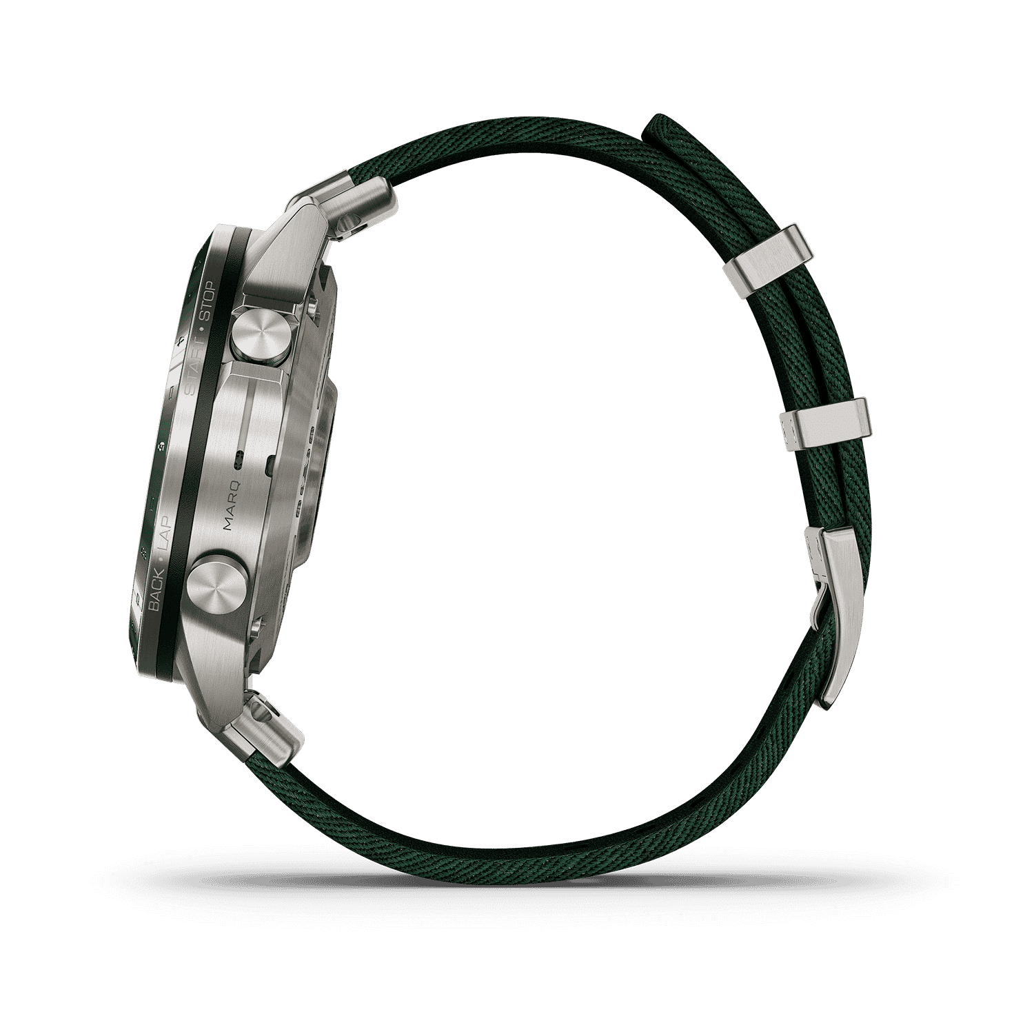 Questo elegante e moderno tool watch è dotato di un cinturino in nylon con motivi jacquard verde tritono, di uno straordinario schermo touchscreen AMOLED con comandi a pulsante tradizionali e di una cassa da 46 mm in titanio di grado 5 per un design ultraresistente.