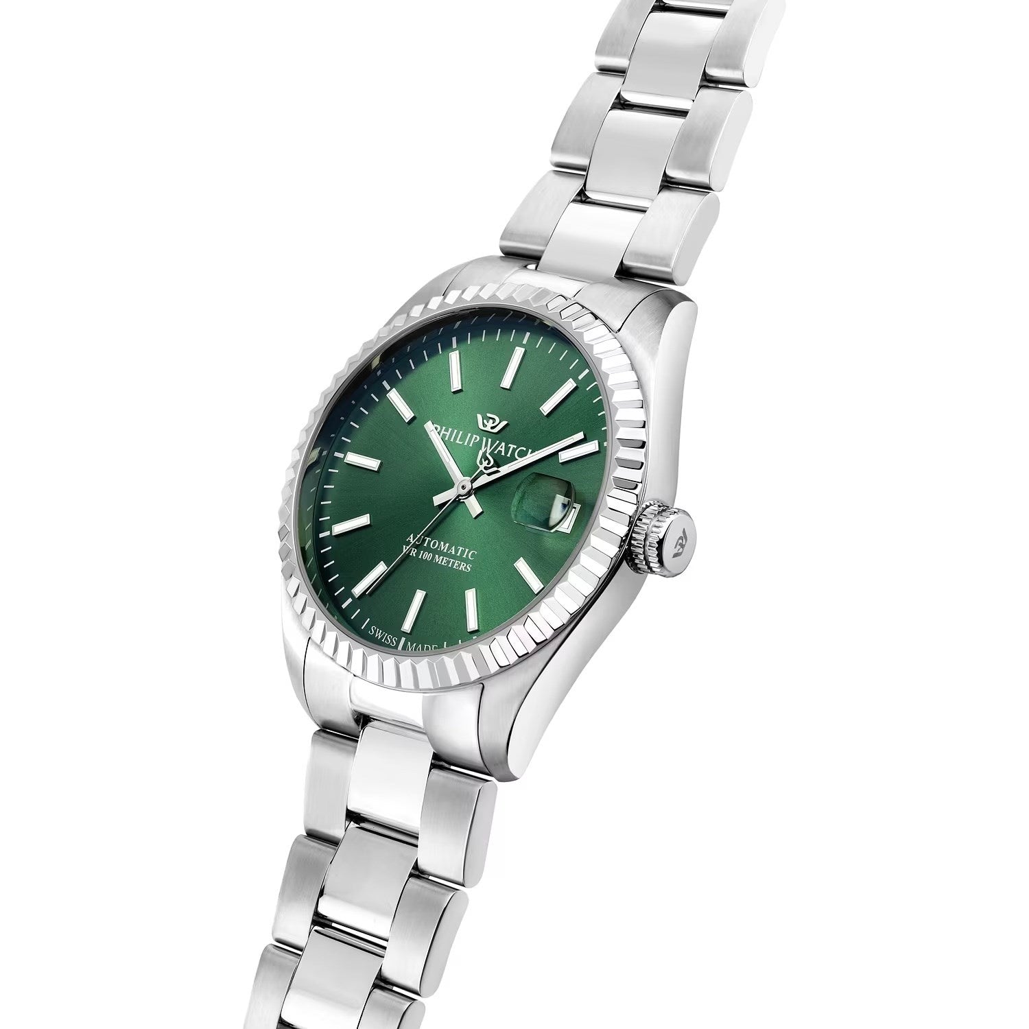 Orologio uomo philip watch, R8223597116, collezione caribe urban, movimento automatico, solo tempo, cassa in acciaio 39mm, quadrante verde con datario, bracciale in acciaio, resistenza all'acqua 10atm