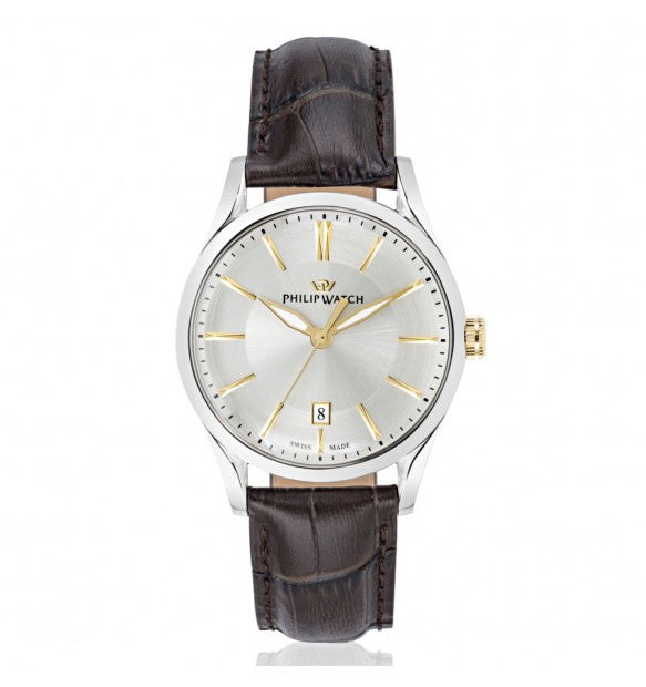 Cinturino in pelle marrone con stampa coccodrillo; chiusura deployante con pulsanti.