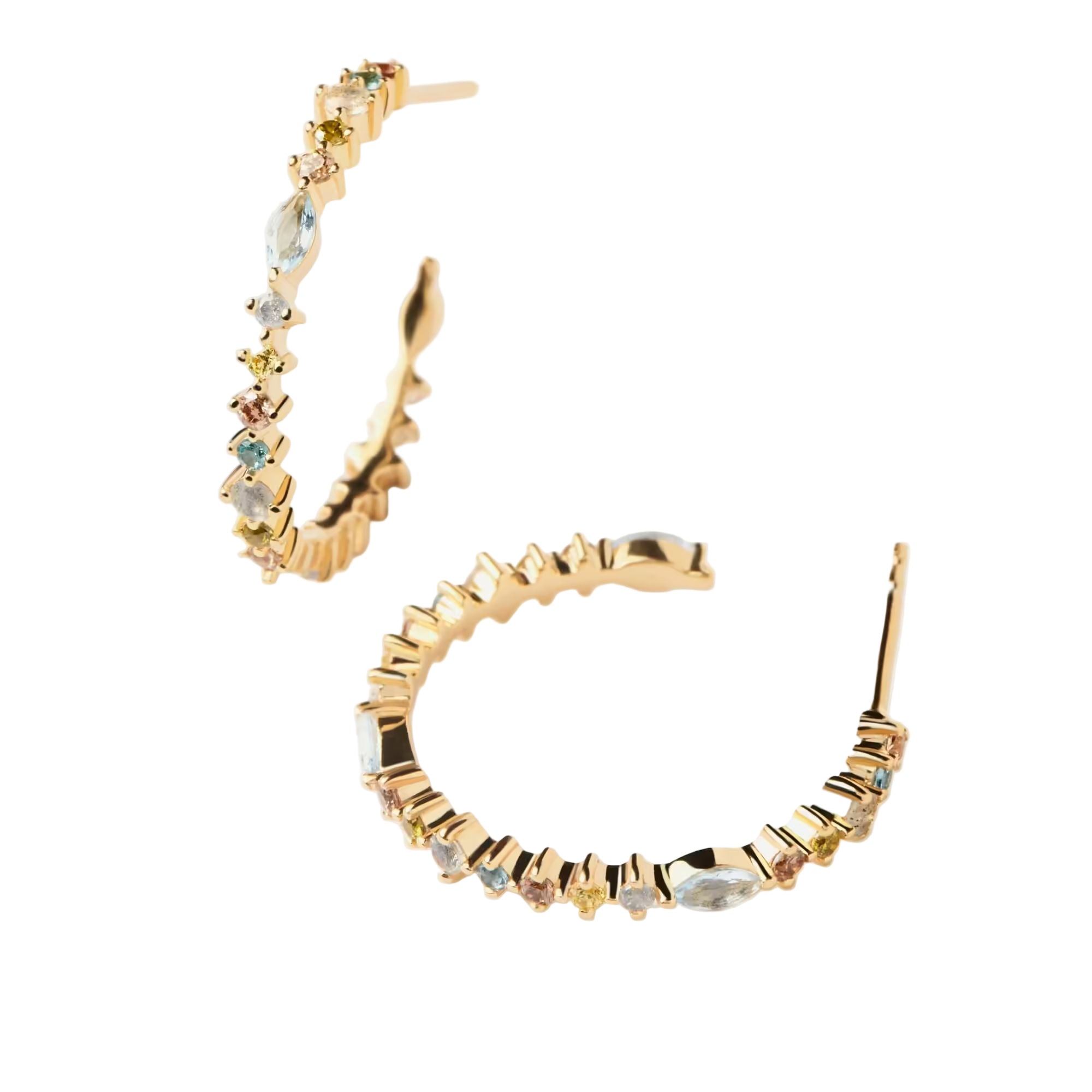 Orecchini da donna di PDPaola della collezione Color. Orecchini a cerchio aperti Iin argento 925 placcato oro 18k con zirconi multiColore di dimensioni e fome diverse. Il peso è di circa 2,95gr. La referenza è AR01-C78-U
