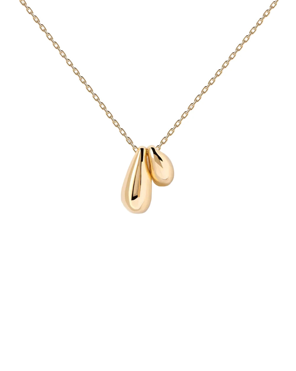 La collana Sugar è realizzata in argento 925 con placcatura in oro 18 carati e due motivi a goccia di dimensioni diverse, che si possono muovere intorno alla catena.