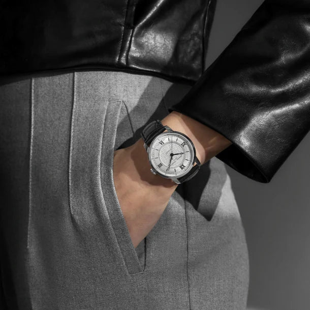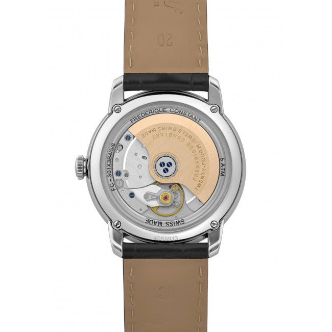 Questo orologio Frederique Constant ha una cassa in Inox con un diametro di 38.5 mm ed è dotato di un cinturino in Pelle. All'interno della cassa si trova un movimento di La Joux-Perret e l'orologio è dotato di un cristallo di Zaffiro.