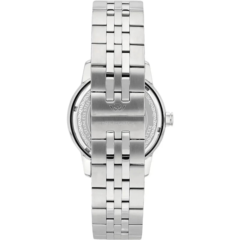 Cinturino in acciaio anallergico color argento; chiusura deployante con pulsanti.
