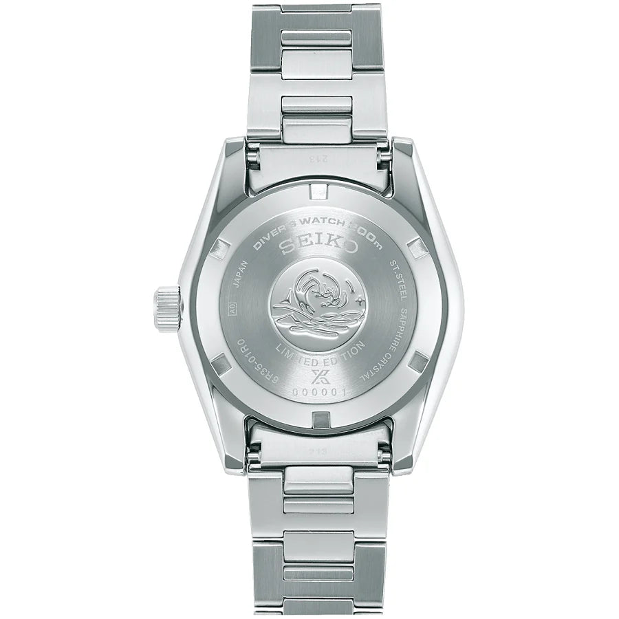 Orologio diver automatico Seiko Prospex "Reinterpretation 1965" ref. SPB213J1 "140° anniversario" LIMITED EDITION. Cassa da 40,5 mm in acciaio inossidabile, spessore 13,2 mm. Fondello e corona a vite che lo rendono water resistant fino a 200 metri. Lunetta blu girevole unidirezionale. Quadrante bianco con datario a ore 3 ed indici luminescenti. Movimento meccanico automatico calibro 6R35 a 24 rubini, 21600 alternanze/ora, capacità di carica manuale e riserva di carica di 70 ore. Vetro zaffiro ricurvo con trattamento antiriflesso sulla superficie interna. Bracciale in acciaio, ansa da 20 mm, con sicurezza e tripla chiusura pieghevole, rilascio a pulsante con estensore. Edizione limitata celebrata sul fondello. Peso 181 grammi.