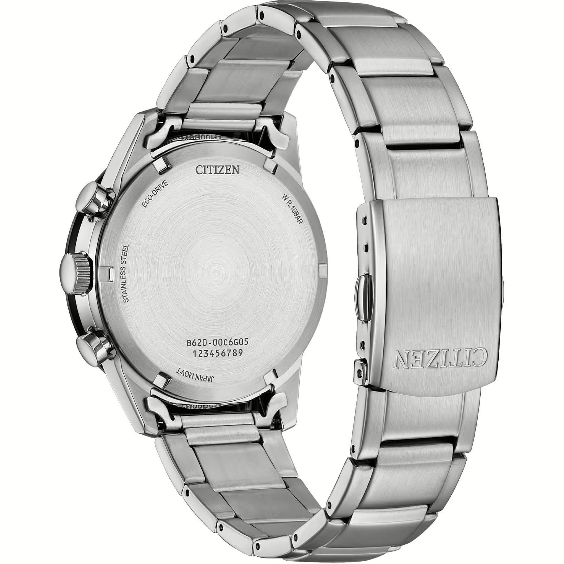 Movimento Eco Drive a carica luce con riserva di carica di 270 giorni. Cronografo a 1/5 di sec. fino a 60 minuti. Cassa in acciaio con fondo serrato a vite. Bracciale in acciaio con chiusura di sicurezza. Lunetta in acciaio trattato IP. Vetro minerale curvato. WR 10 bar. Diametro cassa 39 mm