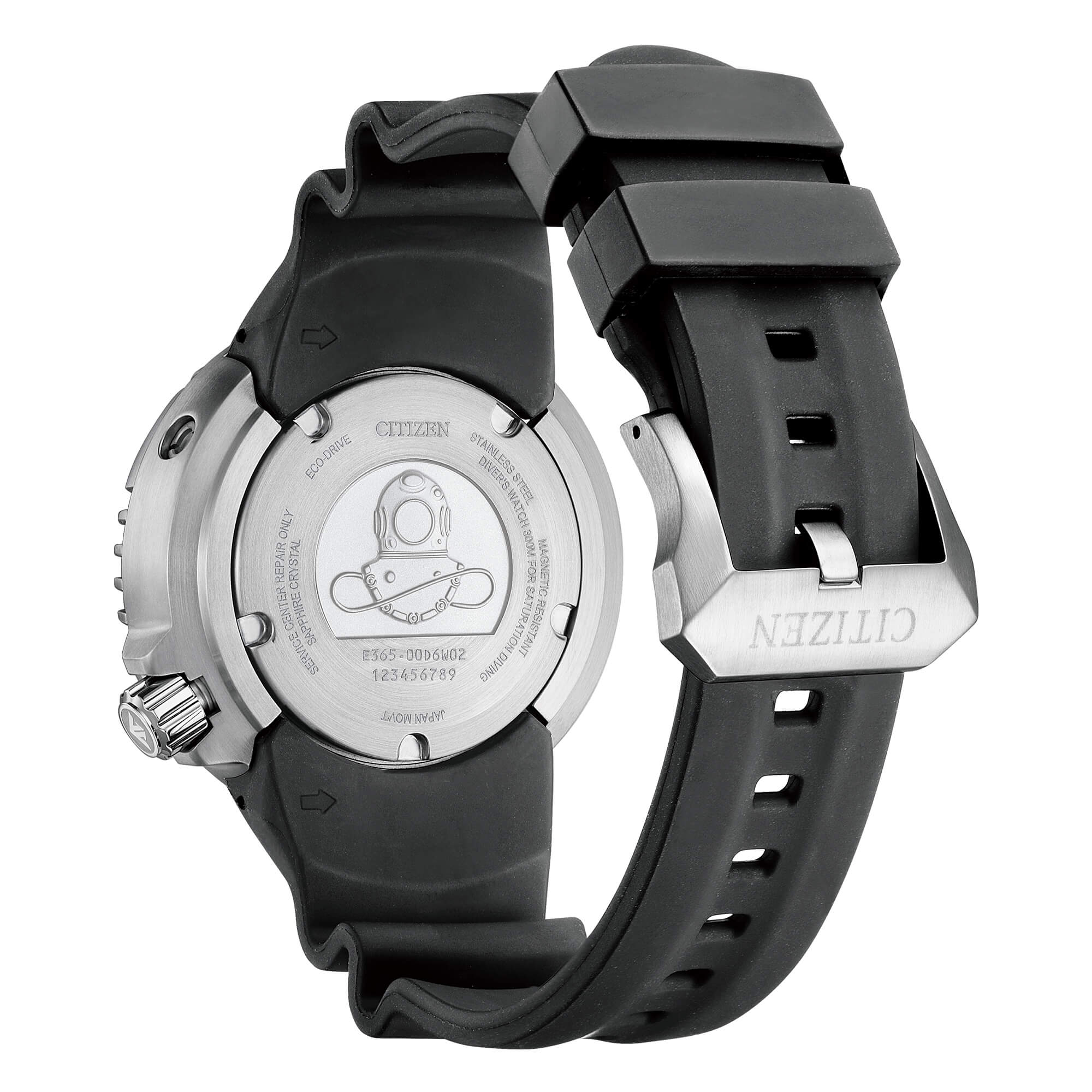 Citizen Eco Drive E365 con riserva di carica di 365 giorni. Cassa in acciaio. Ghiera girevole con inserto alluminio. Valvola per elio. Cinturino in Benebiol PU. Vetro zaffiro con trattamento anti-riflesso. Antimagnetico 4800 A/m. WR 30 bar.Diametro cassa 46 mm