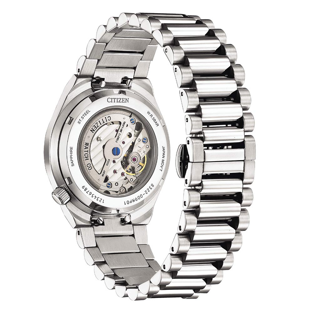 All'interno della cassa troviamo il movimento meccanico di manifattura Citizen 8322 a carica automatica, caricabile anche manualmente tramite corona. Questo movimento funziona ad una frequenza di 21.600 semi-frequenze all'ora, presenta 21 gioielli e una lancetta dei secondi decentrata a ore sei. Il funzionamento del movimento può essere osservato grazie al quadrante trasparente.