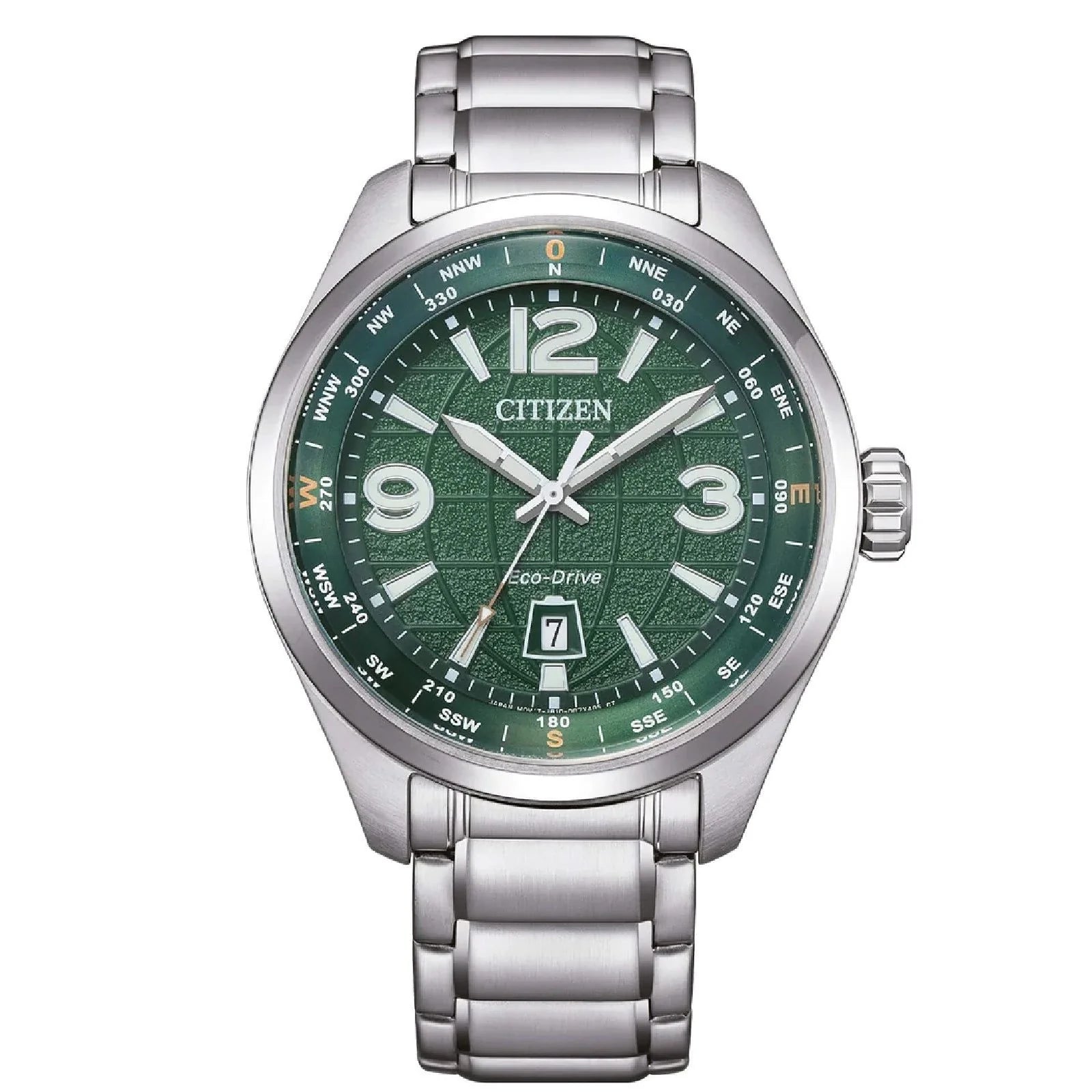 Orologio Citizen NUOVO con garanzia originale Citizen, collezione Urban Traveler, movimento Eco Drive a carica luce con riserva di carica di 210 giorni, cassa da 42mm in acciaio, bracciale in acciaio con chiusura di sicurezza, fondello serrato a vite, quadrante verde, vetro minerale, Wr 100 metri.