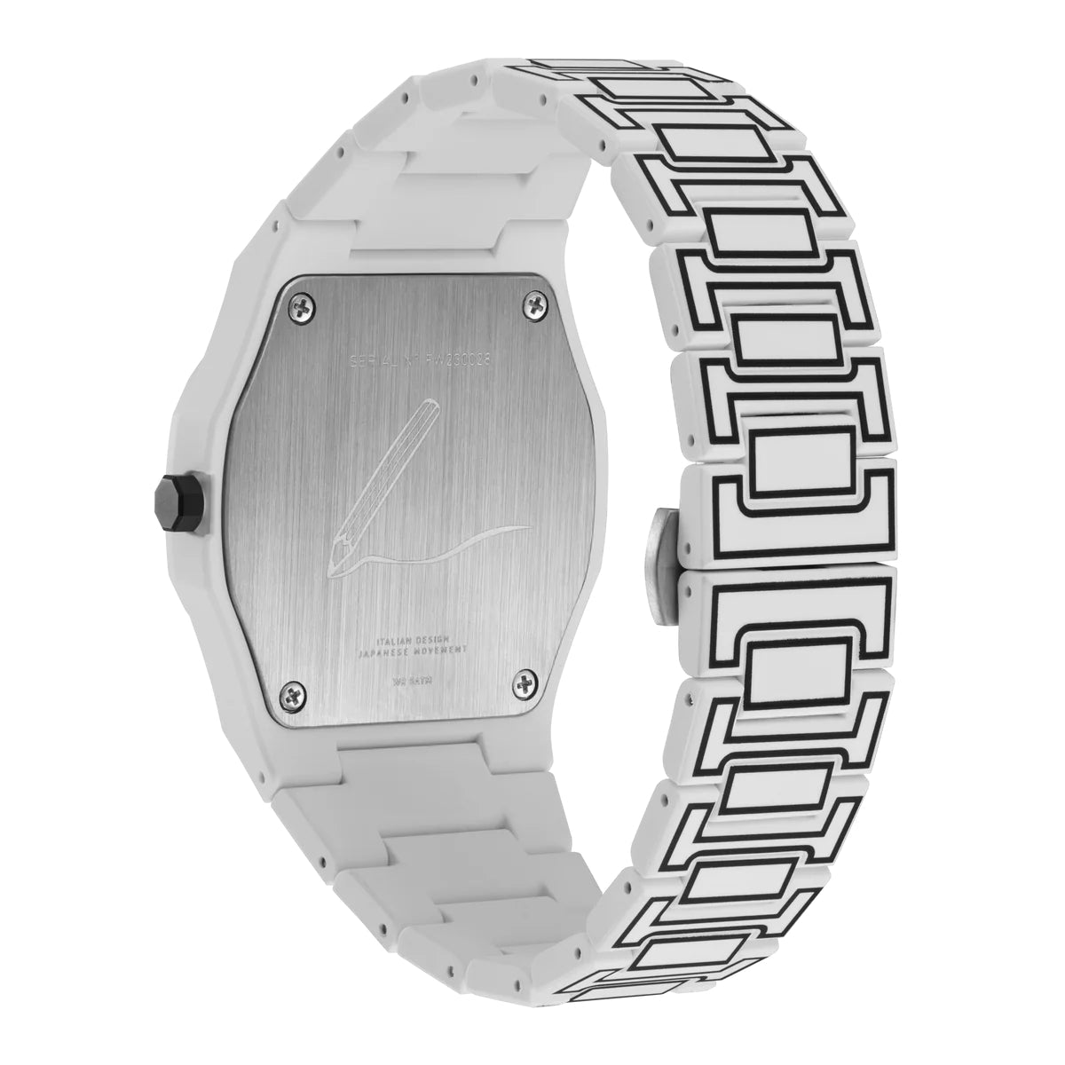 Orologio unisex D1 Milano PCBJ34 Collezione Polycarbon White Sketch bianco opaco con dettagli neri, solo tempo, al quarzo. Questo orologio è stato progettato per trasmettere il concetto di schizzo su un album da disegno e vuole essere un accessorio di design più che un semplice orologio da indossare.