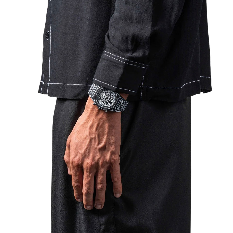 Realizzato interamente in policarbonato con una finitura nera soft-touch, la cassa, la lunetta e il bracciale integrato sono decorati da sottili illustrazioni che tracciano la silhouette stessa dell’orologio.