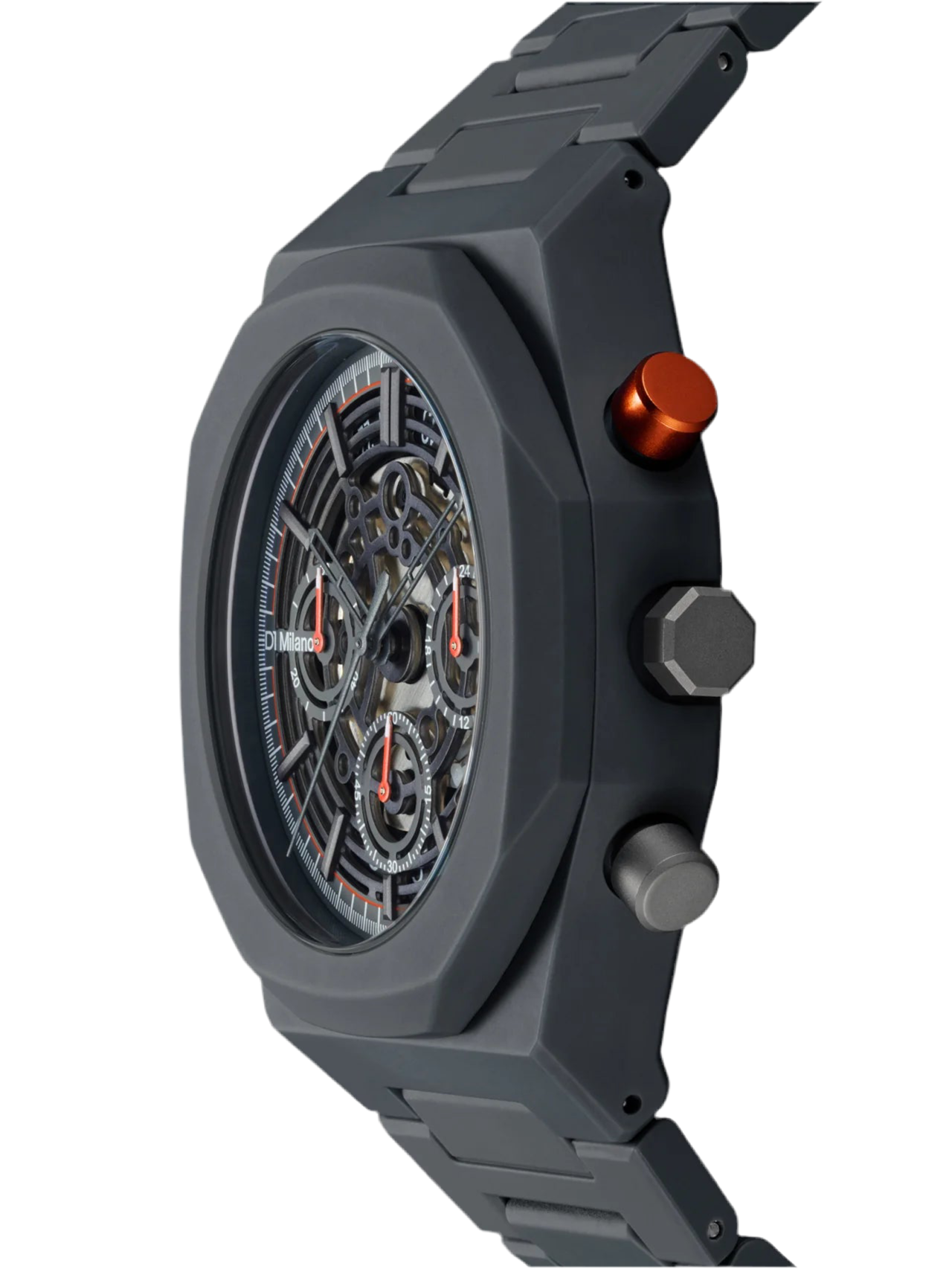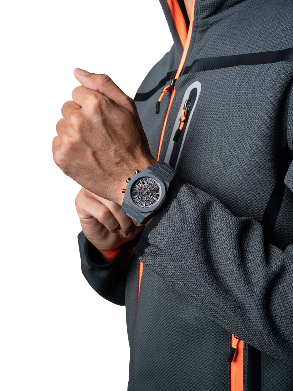 Il modello Polychrono si presenta con una cassa da 40.5 mm interamente realizzata in policarbonato, inclusi bracciale e lunetta, tutti rifiniti con trattamento soft-touch in una tonalità grigio scuro opaca. Leggero e resistente, il policarbonato conferisce al segnatempo un’estetica moderna e una piacevole sensazione al tatto.