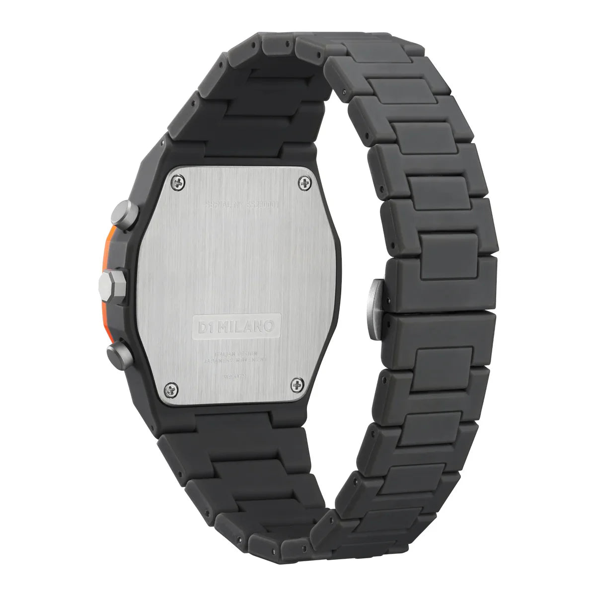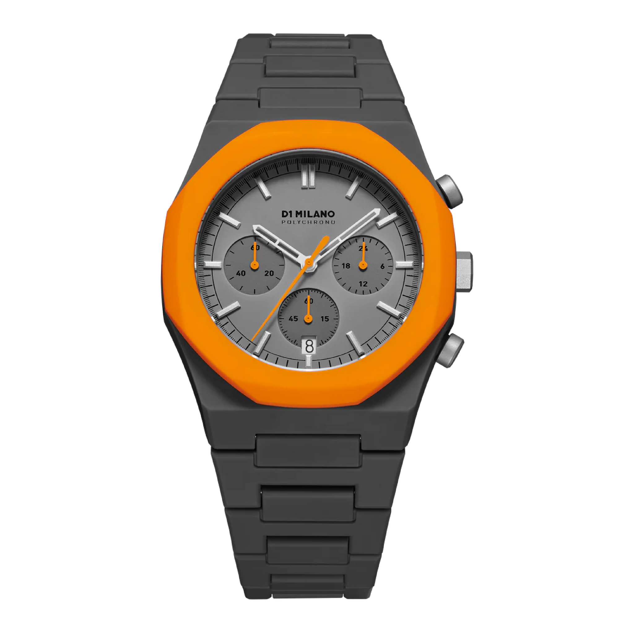 Orologio unisex D1 Milano PHBJ01 Collezione Polychrono Orange Blast grigio opaco con dettagli grigio scuro e arancio, cronografo, tempo e data al quarzo. Un carattere che unisce l'essere divertente e irriverente del Polycarbon con un movimento al quarzo e la funzione fly-back. Il Polychrono pop, fresco e spiritoso punta a diventare un nuovo orologio iconico