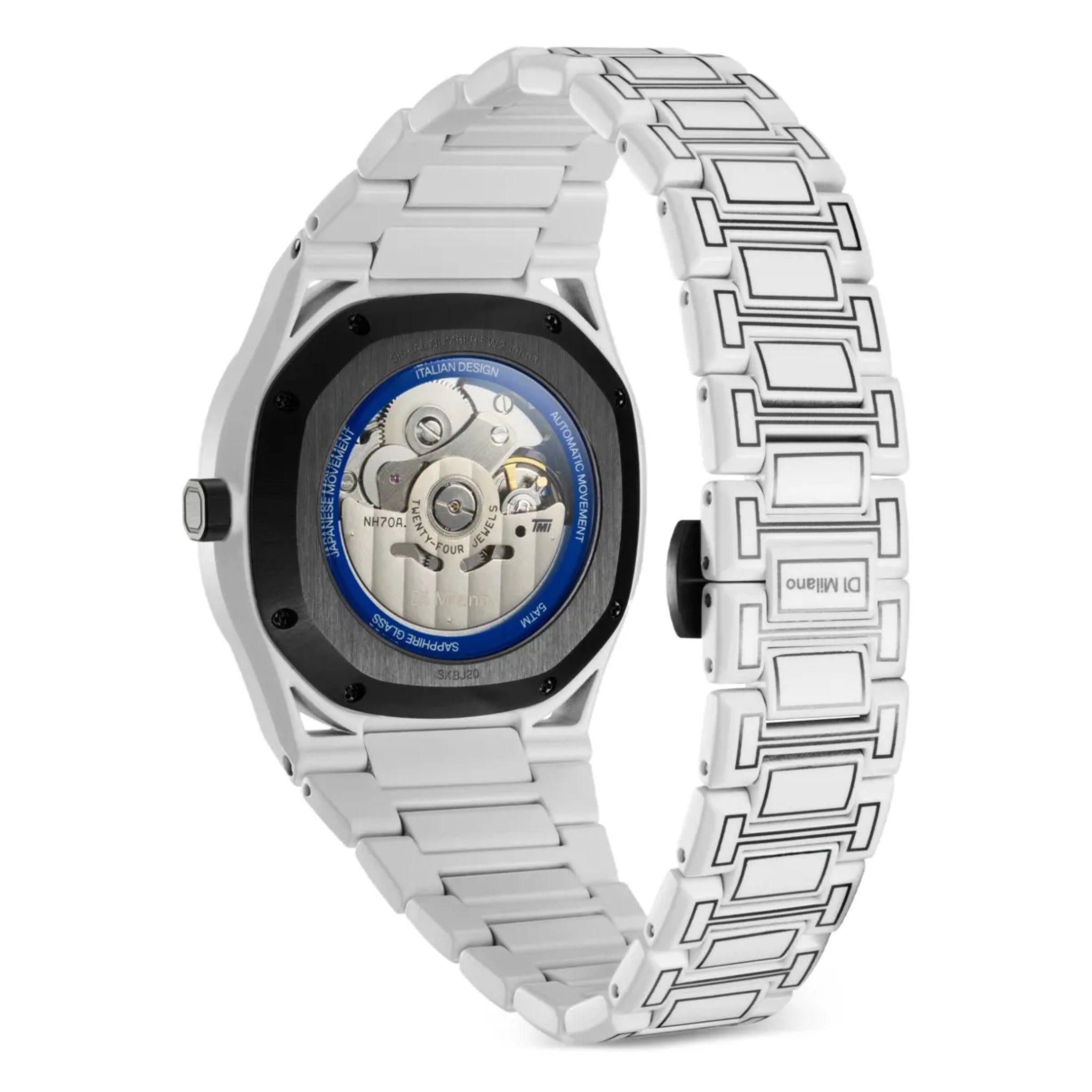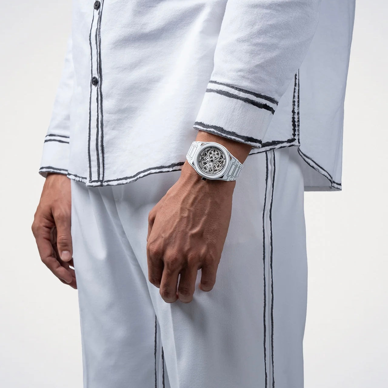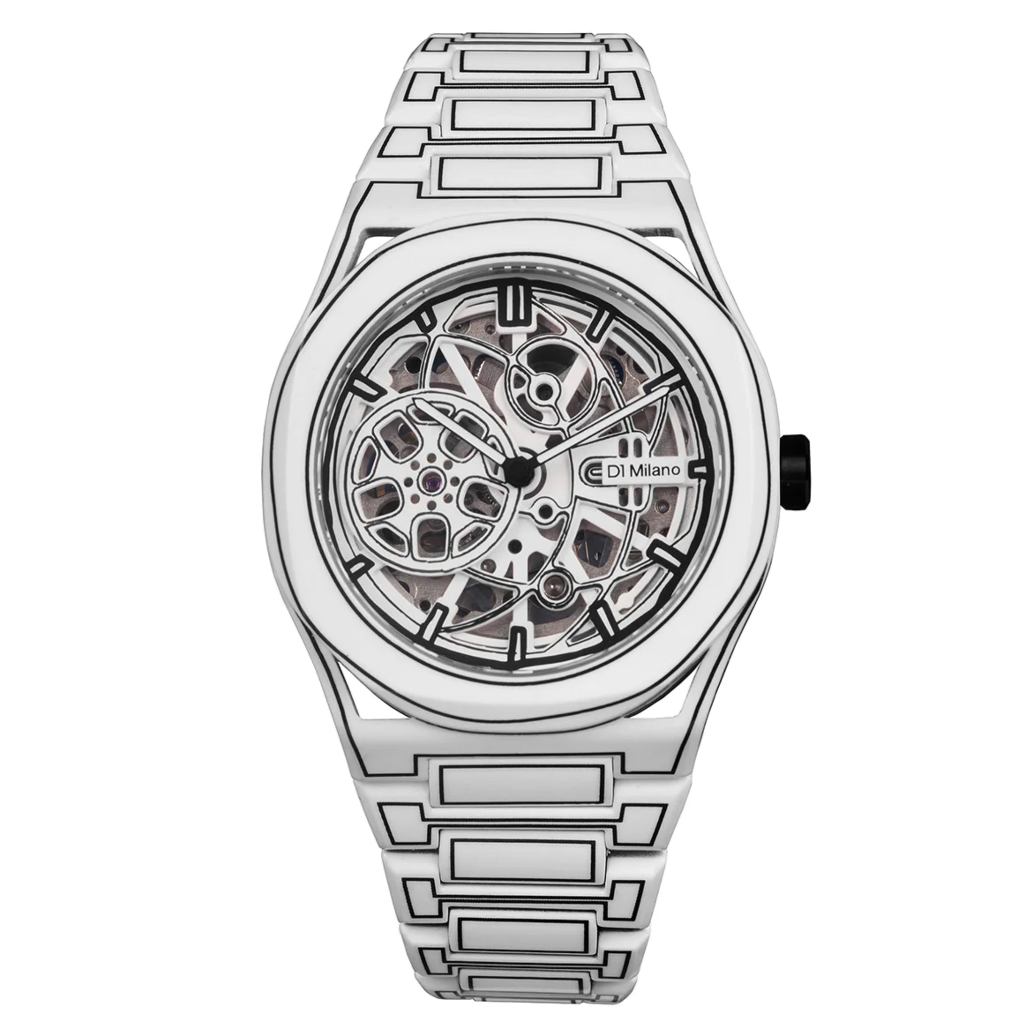Il Skeleton Sketch presenta un rivestimento completo in Cerakote® bianco su cassa e bracciale, una finitura a base ceramica ad alte prestazioni rinomata per la sua eccezionale resistenza a graffi, corrosione e usura quotidiana. Oltre alle proprietà protettive, il Cerakote® garantisce una superficie opaca e uniforme che valorizza le linee nere in stile sketch, facendole risaltare con un contrasto deciso. Questo rivestimento innovativo non solo assicura che l’orologio mantenga nel tempo un aspetto impeccabile, ma ne esalta anche l’estetica, unendo resistenza tecnica ed espressione artistica.