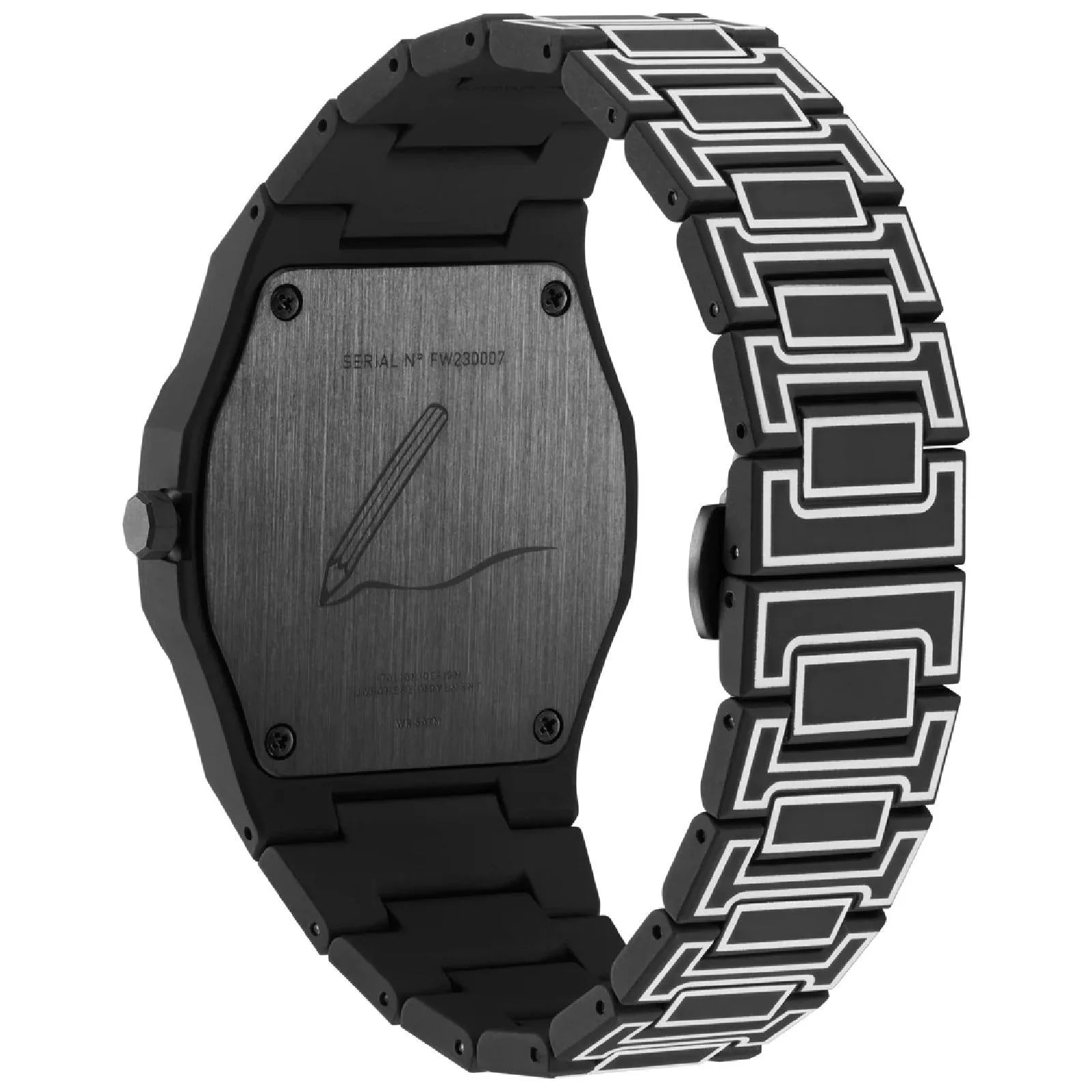 Orologio solo tempo della collezione D1 Milano Polycarbon Sketch uomo. Colore cassa: nero; colore del quadrante: nero; colore del bracciale: nero e bianco. Cassa di diametro 40,5 mm in policarbonato con dettagli bianchi sul quarante e vetro minerale con rivestimento antiriflesso. Bracciale in policarbonato con linee bianche, e chiusura deployante. Movimento al quarzo SEIKO VJ21. Classificazione di impermeabilità (WR) 5 bar: resistente sotto la doccia. Peso: 54 gr.