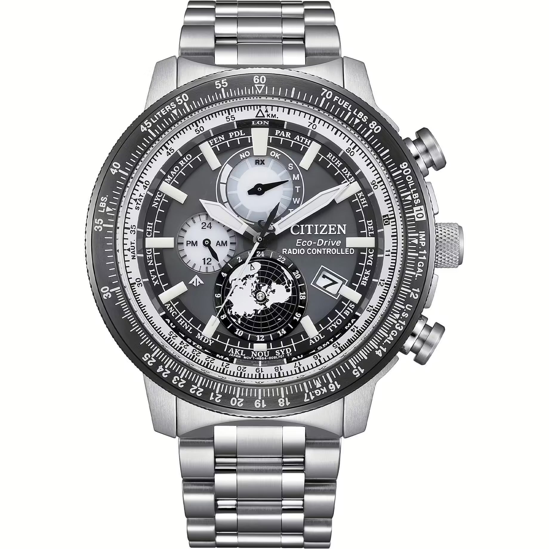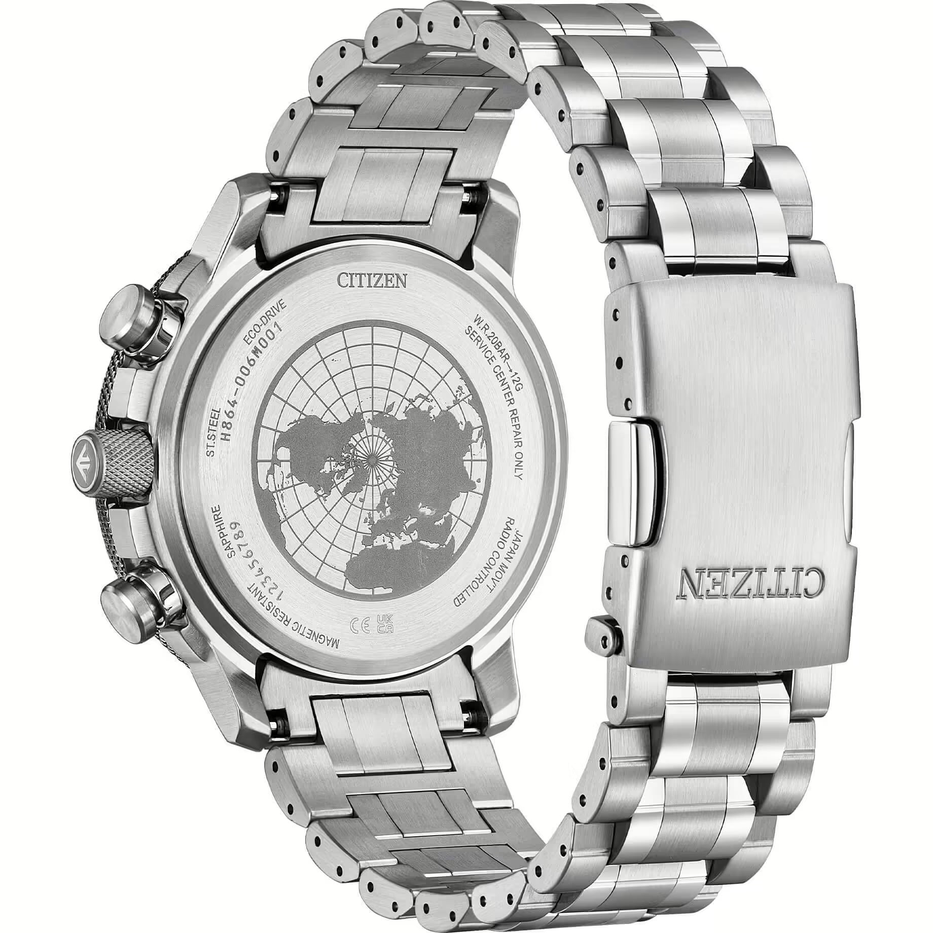 Orologio da uomo del brand Citizen della collezione Promaster geo trekker. Orologio con cassa in acciao con corona a vite e ghiera nera diametro cassa 46 mm. Il quadrante nero con indici e lancette con trattamento luminous e contatori bianchiIl bracciale in acciaio integrato. il movimento è in eco drive a carica luce con riserva di carica fino 2.5 anni cal h864. funzioni Orologio: radioconttralto mondo world timer-caledraio perpetuo-indicatore di riserva di carica e contatore a ore 6 che indica l,ora mondiale tramite un lancetta aggiuntiva sul quadrante. La resistenza all'acqua è 20 atm. Funzione di datario: si. Il vetro è in vetro zaffiro. La referenza è by3006-53h